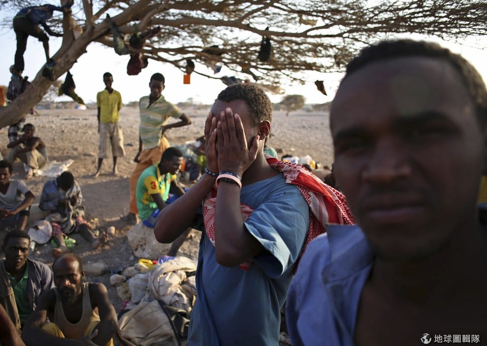 一名來自衣索比亞的非法移民雙手掩面,等著和同伴一起上船進入葉門。