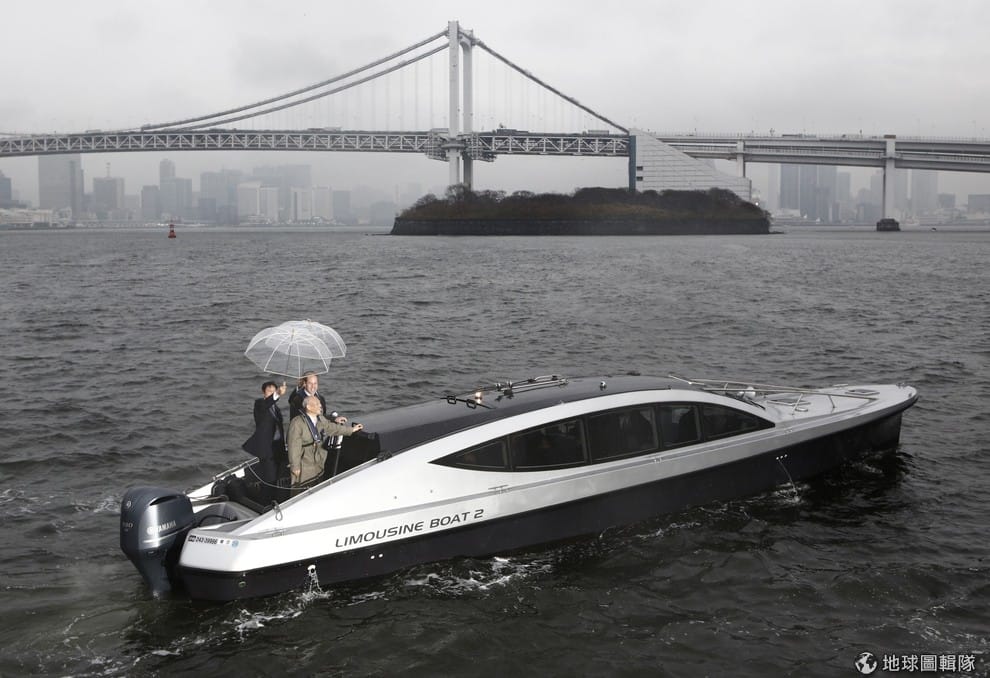 英國威廉王子目前出訪日本,他開心地和東京都知事舛添要一搭乘遊艇欣賞東京灣美麗的風景,東京著名的地標彩虹大橋在他們身後。