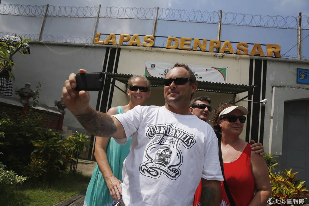 來自澳洲的遊客站在印尼的克羅玻坎監獄(Kerobokan)前合影,這裡關著澳洲籍毒販安德魯(Andrew Chan)、蘇庫馬朗(Myuran Sukumaran) 2人,近期澳洲和印尼兩國因為毒犯判刑案僵持不下,澳洲不願自己國家的犯人在他國判刑,而印尼在 2號這天表示確認會將 2名毒販判處死刑,引發澳洲不滿。