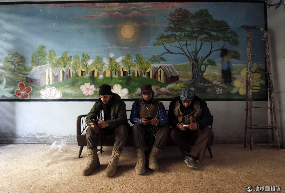 反抗政府軍的民兵團「阿爾蘇坦穆拉德」('Al-Sultan Murad)的士兵們,一起坐在椅子上使用手機。