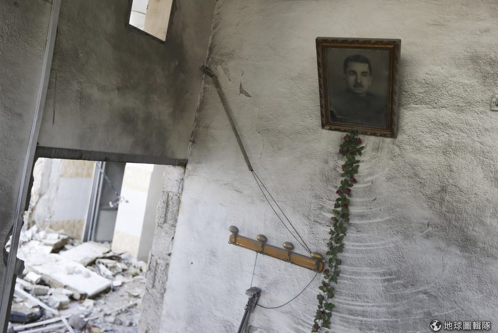 大馬士革市區內,受到反叛軍掌控的區域中可以見到民宅因為戰火攻擊殘破不堪,只剩下民眾的畫像掛在牆上。
