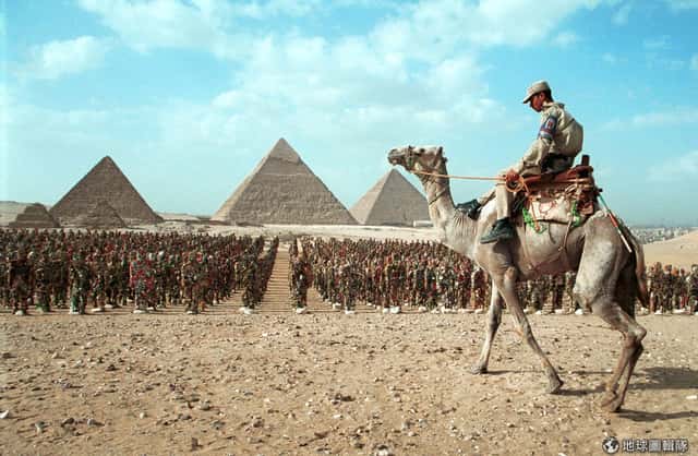 蕭特在1996年展出的作品「垃圾大軍」(Trash People)得到大量的迴響後,他決定帶著這個「軍團」開始環遊世界。照片中的垃圾大軍來到世界知名的「吉薩金字塔」前,前方是埃及的巡邏警察,不仔細看真看不出是垃圾做成的藝術品!