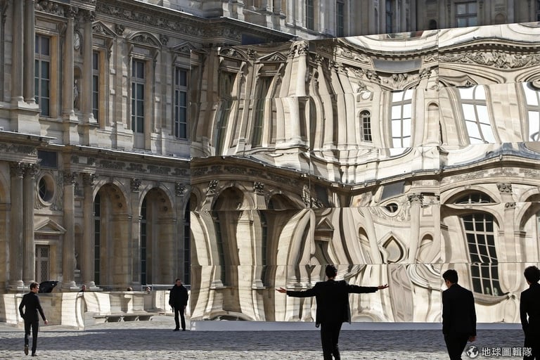 羅浮宮建築群最東端的卡利庭院(Cour Carree)內,館方人員為了Dior 2015-2016秋冬成衣系列準備了巨型的鏡面擺飾。