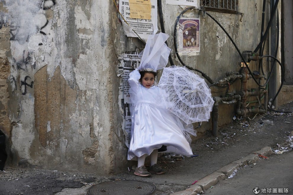 照片中猶太正教的女孩穿成新娘的模樣站在路邊, 6號這天是猶太信仰中的「普珥節」(Purim),對猶太人來說,普珥節是紀念他們沒有被滅族的重要節日之一。