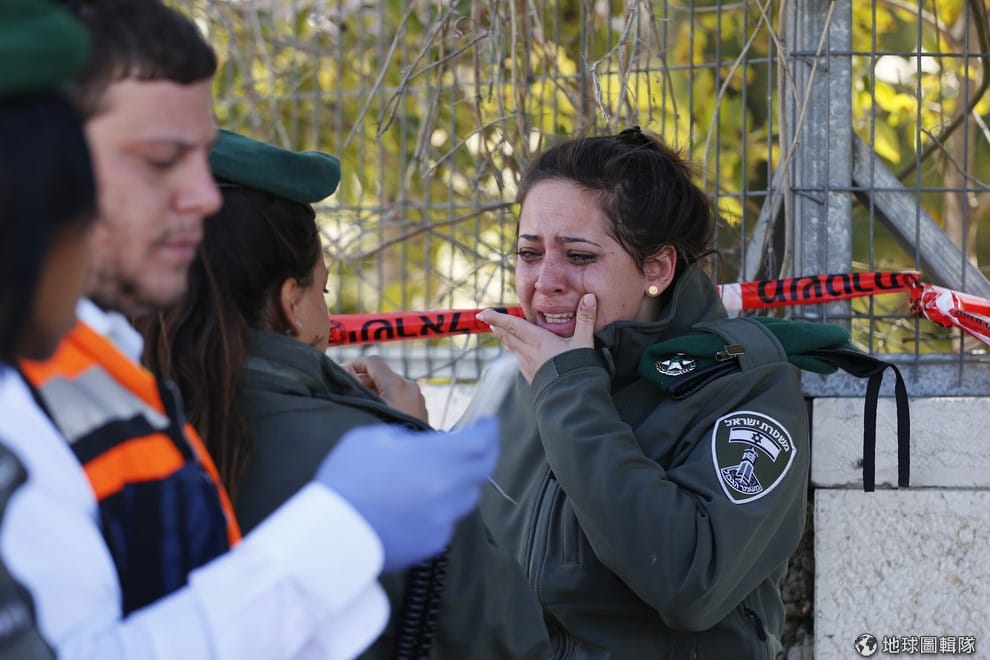 女警看到案發現場難過地大哭,報導指出,1名疑似巴勒斯坦人,在耶路撒冷(Jerusalem) 1處警察局附近,開車撞倒 5個人, 5人全都受傷;這名暴徒隨後遭到安全警衛開槍擊中受傷。