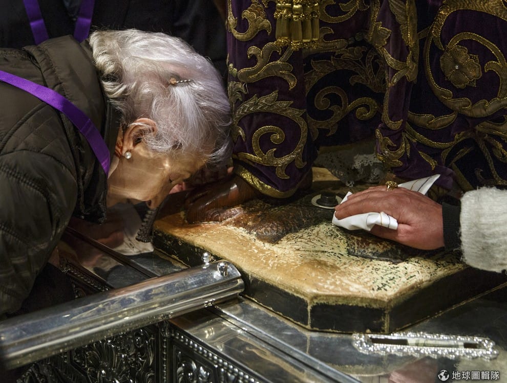 婦人虔誠地親吻眼前的麥地納賽里耶穌像(Jesus de Medinaceli),每年 3月的第一個星期五,信眾們會湧入馬德里的麥地納賽里大教堂,祈禱天主庇佑。