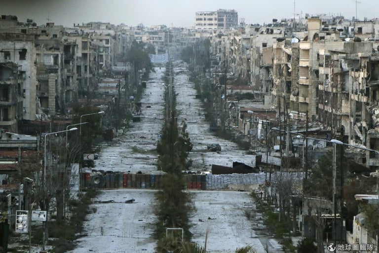 陽光籠罩的阿勒坡大城內,可以見到塞夫艾道拉區(Saif al-Dawla)因為戰火衝擊,城市街區只剩下灰暗的碎石磚瓦。遠處的街道上有著成排的防禦用沙袋。