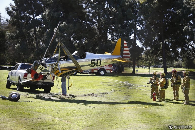 消防隊員將墜毀的小飛機殘骸吊起,這座飛機的駕駛是美國知名影星哈里遜福特(Harrison Ford),他在 6號時傳出意外墜機的消息,報導指出,哈里遜福特駕駛的小飛機墜毀洛杉磯市郊高爾夫球場,差幾公尺就要撞上屋宅。他事發當下曾對航管塔台倉促說「發動機故障」,準備「立即折返」。
