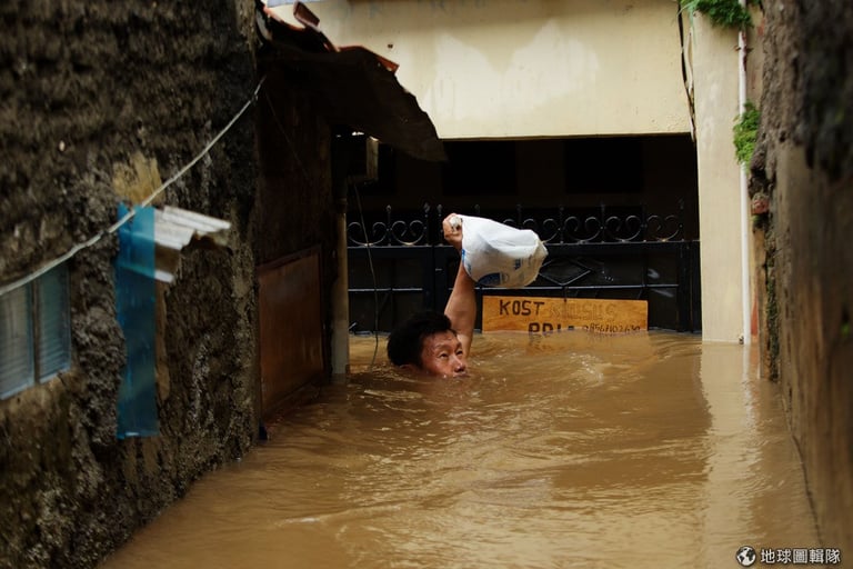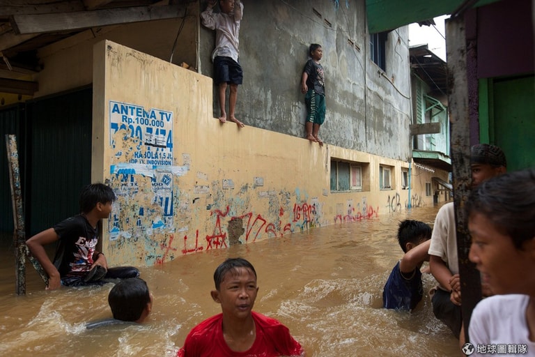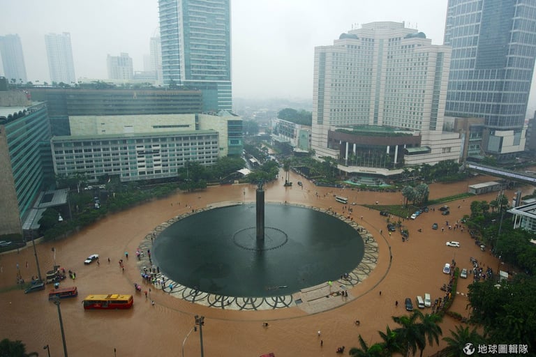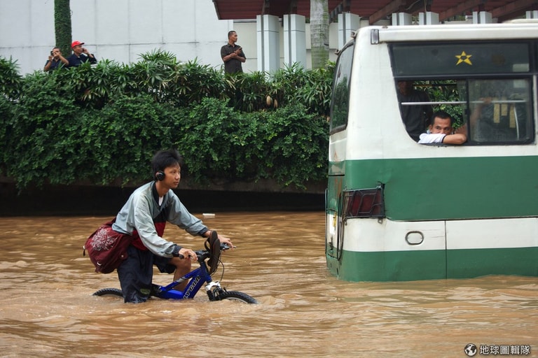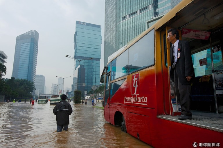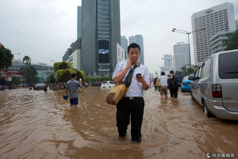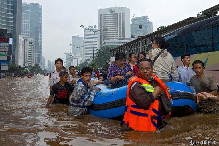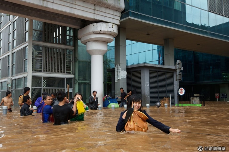 這幾天連續大雨的影響,印尼首都雅加達深陷在水患的危機中,只見大水漫過鬧區街道,讓平常充滿人車的街區現在全成了一片水鄉澤國;市中心內已累積有1公尺高的水位,車輛無法行駛,交通因而癱瘓大亂,許多居民只能靠著自己的力量涉水而過;其他低窪地區,甚至出現高達2-3公尺的水位,目前已知有4位居民不幸喪生,其中2名還是10多歲的孩童,也有2萬名居民因大水必須撤離家園。
