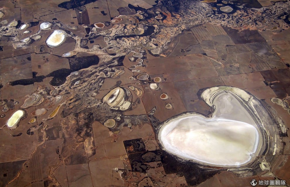 伯斯(Perth)的郊外可以見到農作區因為乾旱天候影響,留下一片深褐色的景象,一旁的鹽田和見底的水庫因此變得更加顯眼。