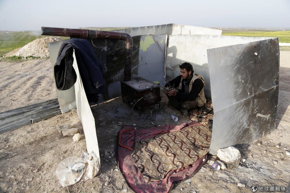 敘利亞反政府軍躲在臨時搭建的遮蔽處,他忙著用柴油生火。