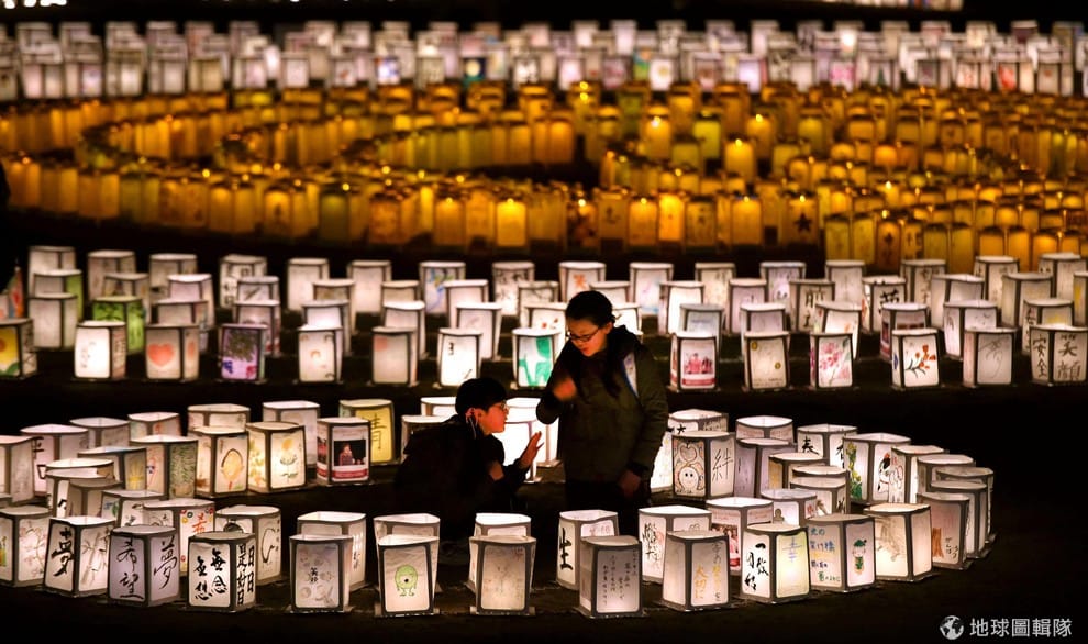 照片中是悼念 311大地震逝者的點燈活動現場,大地震在今年邁入 4周年。
