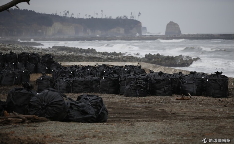 輻射汙染物接著被放進黑色和藍色的袋子中,福島四處都可見到它們的蹤跡,從稻田、停車場甚至是居民後院,都能見到這些藍黑色袋子堆在一塊。