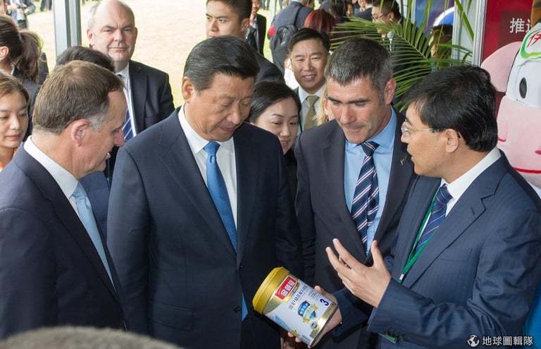 去年,紐西蘭總理凱伊(左)在中共國家主席習近平(左二)造訪紐西蘭時,向他介紹紐國的奶粉。