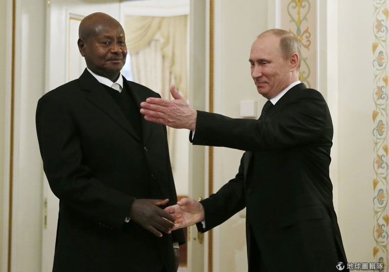 俄國總統普亭和烏干達總統穆塞維尼握手,俄國將要在烏干達建立煉油廠。