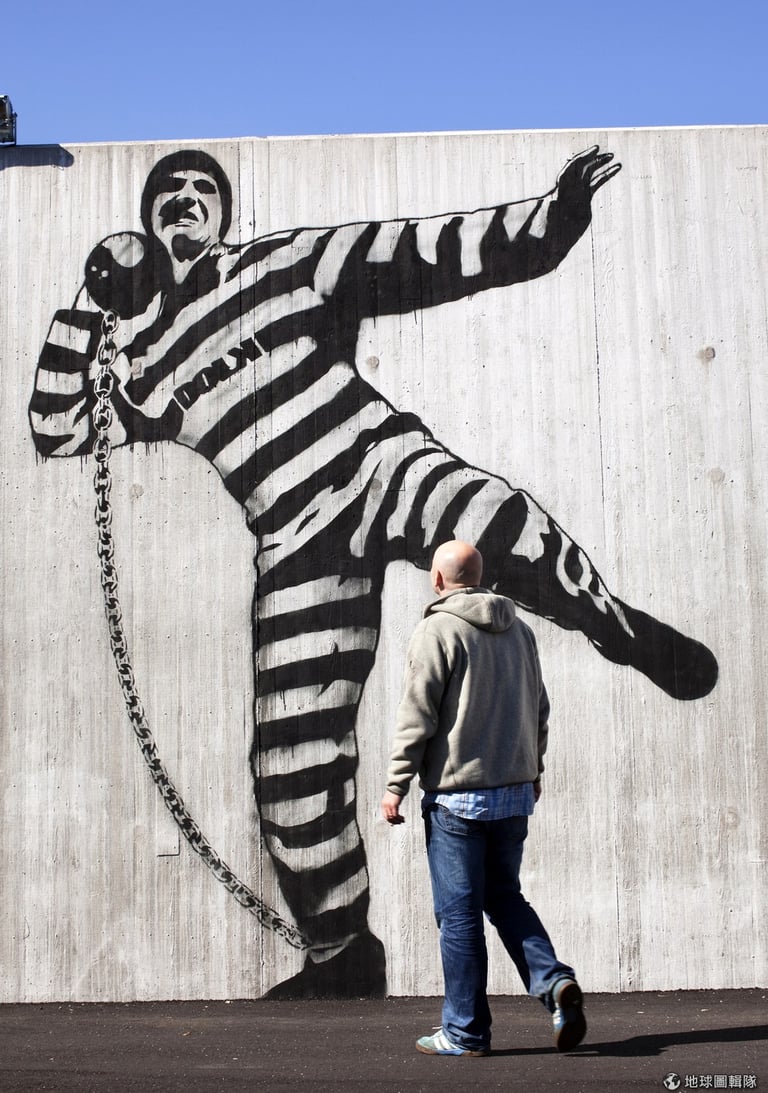 一名男子走向哈爾登監獄牆上的塗鴉畫。