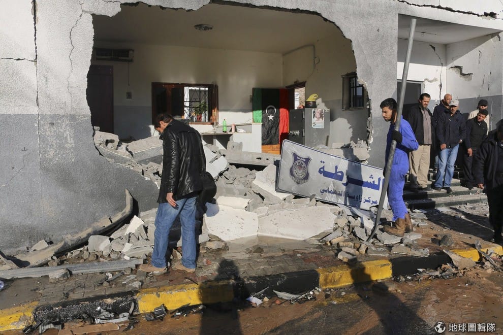 照片中的民眾看著被炸出大洞的警局,這裡日前受到效忠伊斯蘭國的軍人攻擊。
