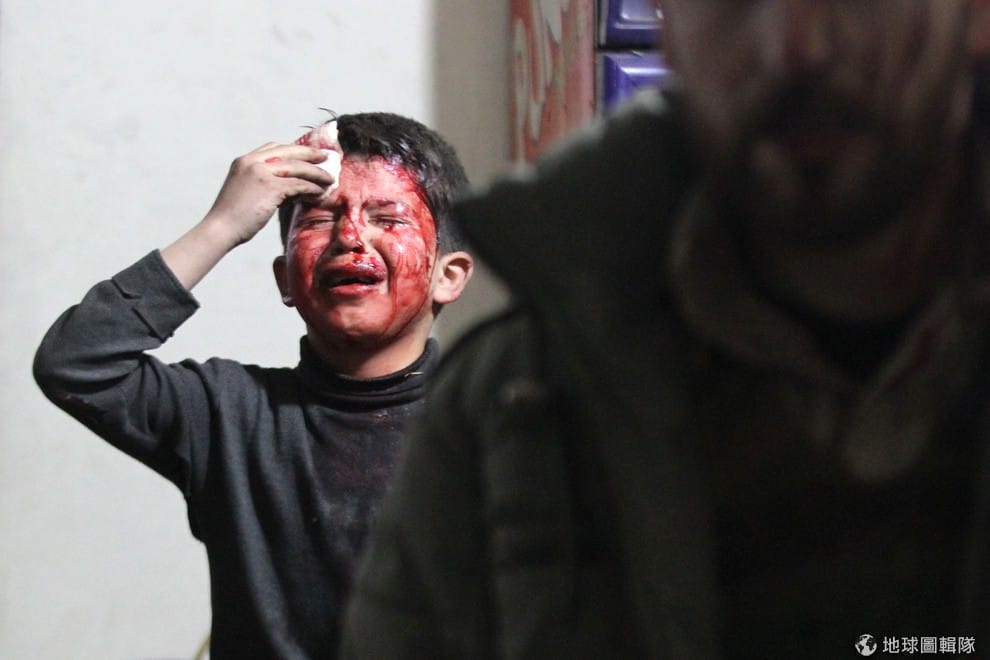 男孩滿臉鮮血並不斷哭泣,他所住的杜馬區受到政府軍的轟炸。