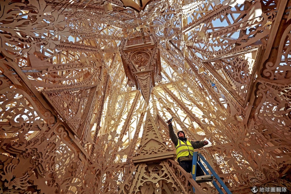 燈光師正在對藝術品做最後確認,這座藝術品由加州藝術家貝斯特(David Best)發起,他集結了來自不同社區的 100多位民眾齊心合作,目的是要展現藝術品的改變力量。這座藝術品在 3月21日的傍晚時分將被送進大火燃燒。
