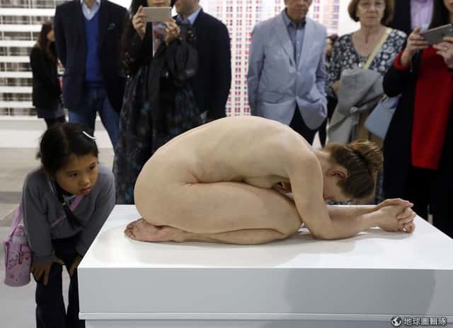 參觀民眾看著眼前的作品「無題」,這是出自澳洲藝術家金克斯(Sam Jinks)之手。巴塞爾藝術展(Art Basel)來到香港並舉辦了大型展覽,當中作品來自全球 37國共 233間藝廊,含括時期從 20世紀初期至現代。