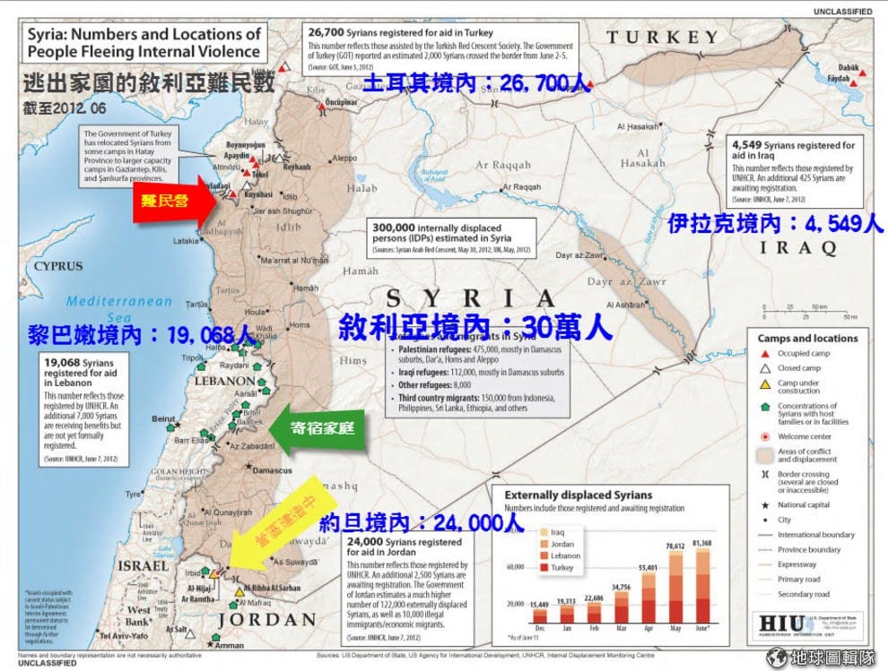 地球圖輯隊截至 2012年6月的敘利亞難民數字。Photo credit: US state department/地球圖輯隊編譯。