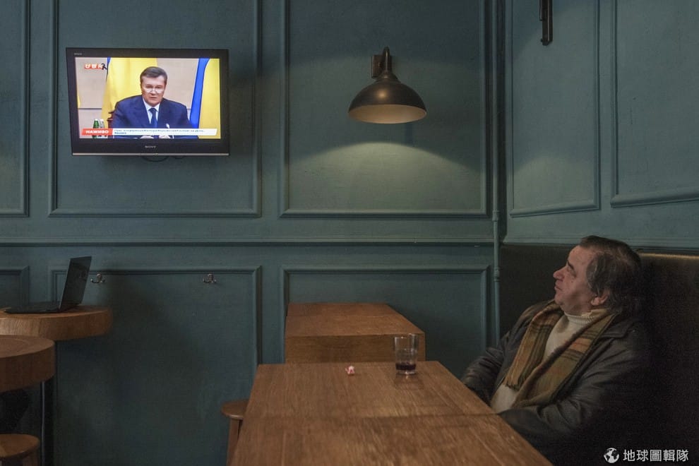 看著電視報導烏克蘭危機的民眾。