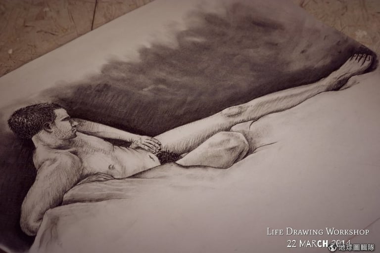 當我看著眼前一群手拿炭筆,迫不及待想在白紙上大肆揮灑的藝術家陣仗時,我深吸了口氣,並提醒我自己不要和任何人有目光接觸,接著,我就解開身上的袍子,讓它落到地面。我擺好姿勢,同時把 43歲的肚子往內縮,心裡面滿是想把兩手交叉遮住重點部位的衝動,這時候我還能感覺到全身血液全往頭上臉上竄的熱度。