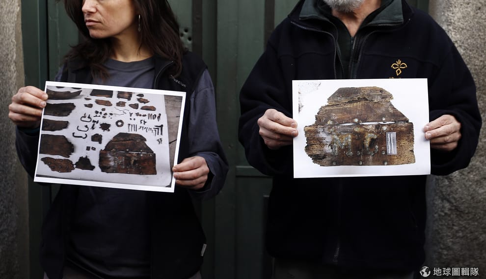 專家手裡拿著遺骨的照片,這些遺骨就是他們在修道院龕位裡發現的骨骸,他們還發現了寫有M.C.的棺材碎片,推測M.C.有可能是賽凡提斯(Miguel de Cervantes)的縮寫。