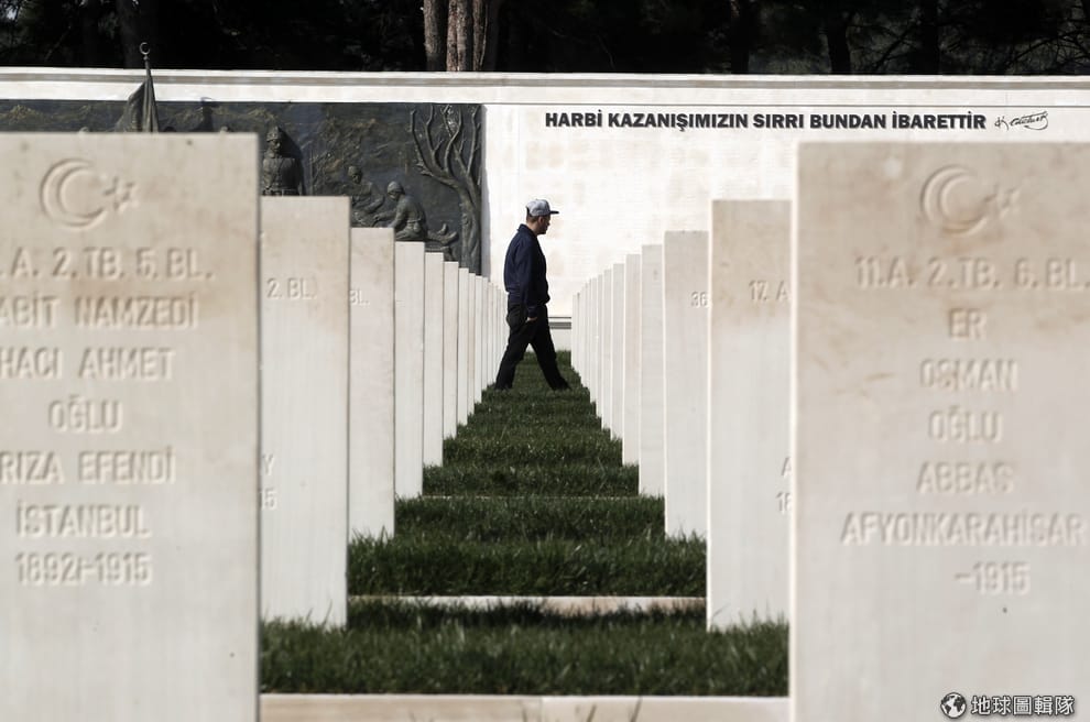男人走在墓園裡,這座墓園是用來紀念在第一次世界大戰加里波里之戰死亡的土耳其士兵。加里波里之戰即將滿 100周年,當地舉辦了典禮活動,紀念當時戰死的士兵。