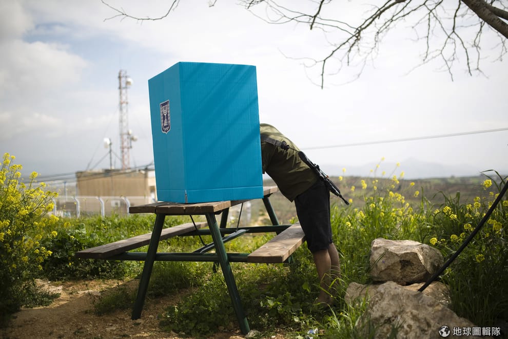 約旦河的西岸地區,以色列士兵在投票所裡投票。17號是以色列的國會大選,數百萬名以色列人都參加選舉,投下神聖的一票。在這次大選,以色列總理納坦雅虎(Benjamin Netanyahu)雖然面臨了中央偏左政黨的強大挑戰,但仍是取得勝利,再次連任總理。