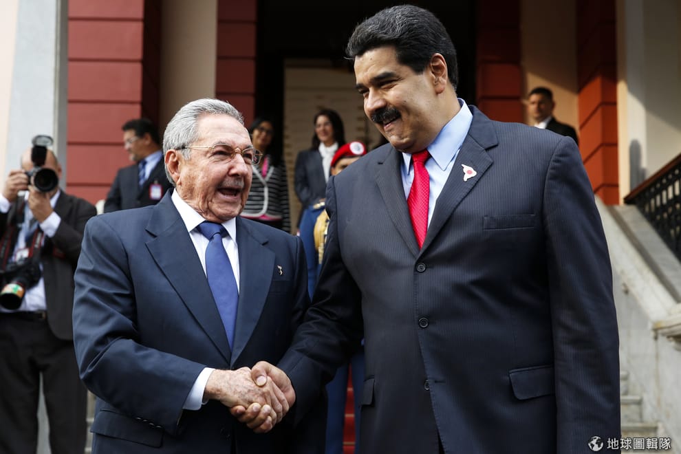 委內瑞拉總統馬杜洛(右,Nicolas Maduro)和古巴總統卡斯楚握手(左,Raul Castro)。在美國 3度制裁委內瑞拉之後,美洲玻利瓦爾同盟(ALBA)的領導人們在委內瑞拉首都會面,表達他們對委國的支持。