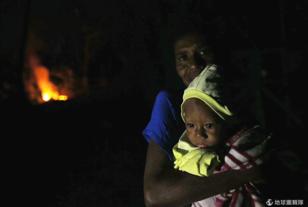 一名女性抱著 3歲小孩站在家門外,他們的家已經被熱帶氣旋摧毀。14號時,熱帶氣旋帕姆(Pam)襲擊南太平洋上的萬那杜共和國,已知有 24人喪生,另有 3,300人失去家園等待救助。