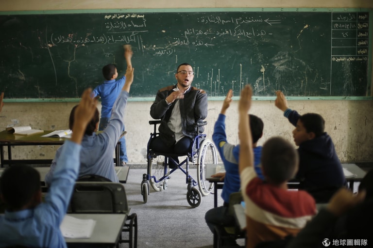 25歲的沙瓦費里(Ahmed al-Sawaferi)坐在輪椅上教書,他在 2008年以色列空襲的時候失去了雙腳和左手,現在在加薩的一所國小裡教書。