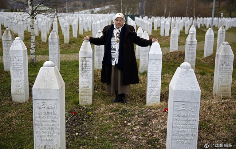 愛芬迪(Fadila Efendic)摸著先生和兒子的墓碑,她的先生和兒子死於一場大屠殺中。18號時,塞爾維亞逮捕了 8名涉入「斯雷布雷尼察大屠殺」的嫌犯。
