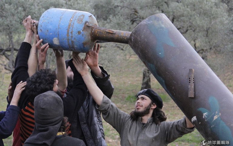 反政府的蘇克沙姆旅(Suqour al-Sham Brigade)正在把當地製的砲彈塞進砲管裡,準備向效忠敘利亞總統阿薩德(Bashar Al-Assad)的軍隊開砲。