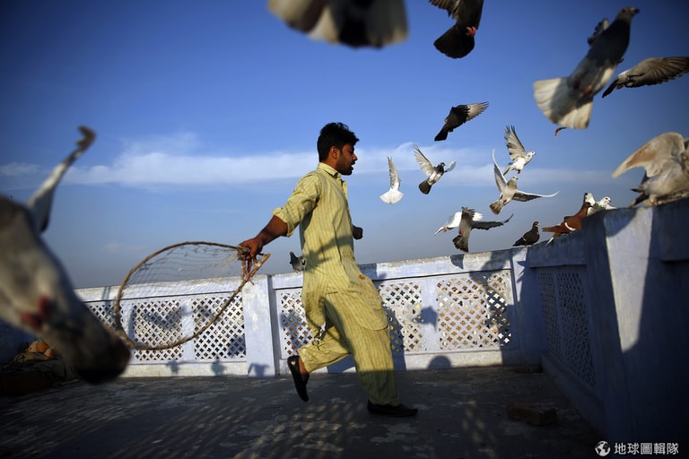 印度德里的居民站在屋頂上,揮手讓他飼養的鴿子飛走。