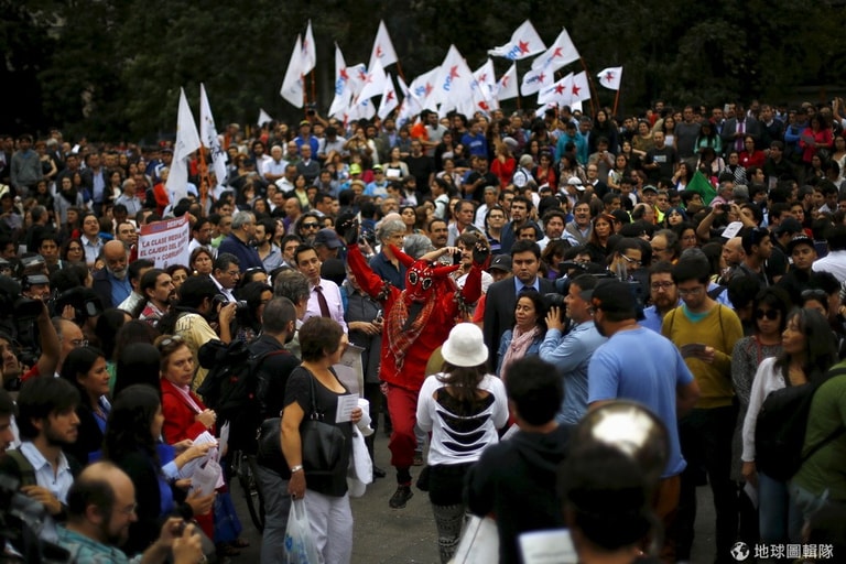 男人穿著全身紅色的衣服跳舞,他的周圍聚集了許多民眾。在智利的首都聖地牙哥,有數百名民眾參加遊行,要求智利政府舉辦公投制定新的憲法,終結現在的憲法。