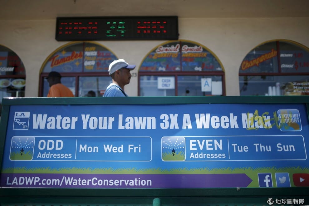 為了因應乾旱,加州政府也在看板上呼籲民眾一周最多只要給草坪澆三次水就好了。