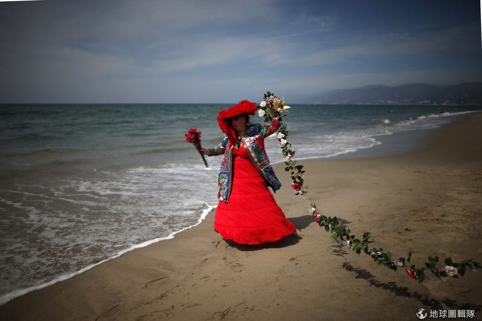美國聖塔莫妮卡市區海岸旁,穿著大紅衣的民眾牽起編織好的花圈,慶祝春天的到來。