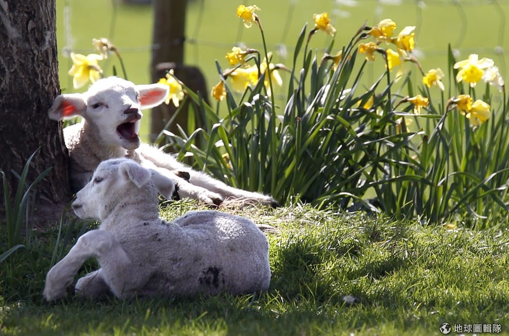 英國的農莊(Hall Farm)迎接新生命,小羔羊在水仙花間打起大大呵欠,相當愜意。