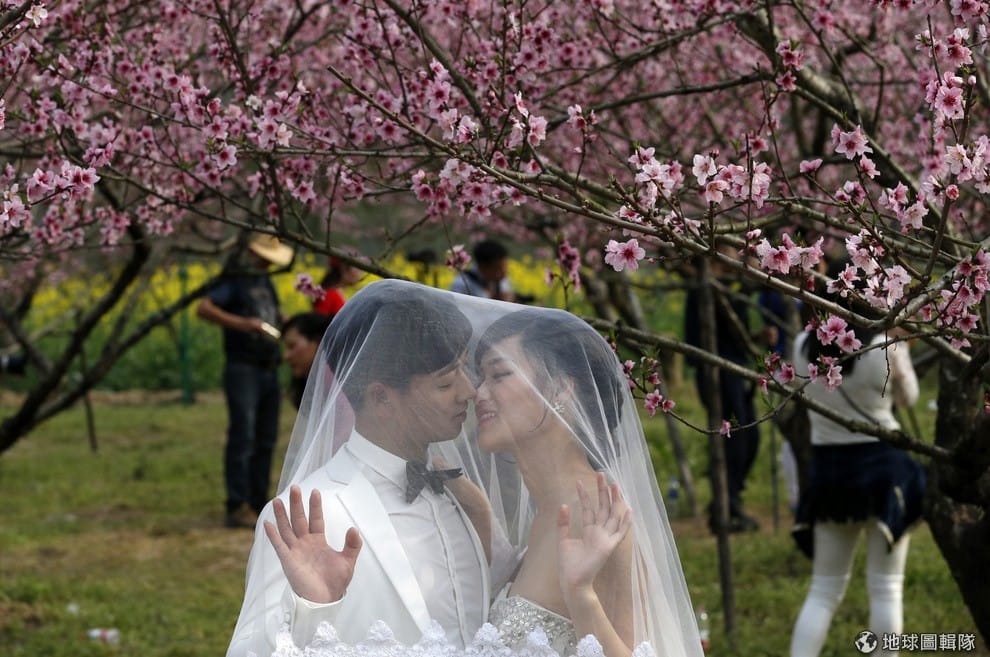 浙江省的溫州市區公園內,新人趁著春暖花開拍攝婚紗照。