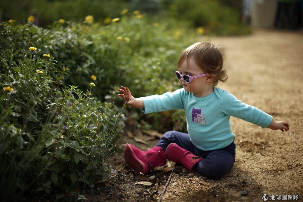 春天正好是讓小朋友認識世界的好時機,照片中是一歲 3個月大的亞美莉亞,她好奇伸手往花叢探一探,她的爸媽在正式進入春天這天,帶她到自然歷史博物館中玩耍。