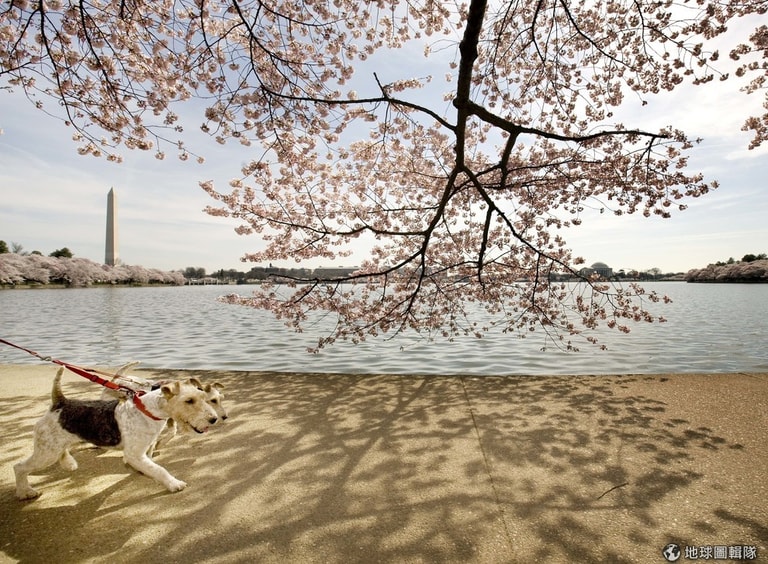 春天一到,華盛頓著名景點潮汐盆地(Tidal Basin)就會出現整片的粉色櫻花,原本單調的河岸景象瞬間化身成最適合出遊的目的地。儘管氣溫仍帶冷意,但是碰上出太陽的時候就適合帶著毛小孩出門去。