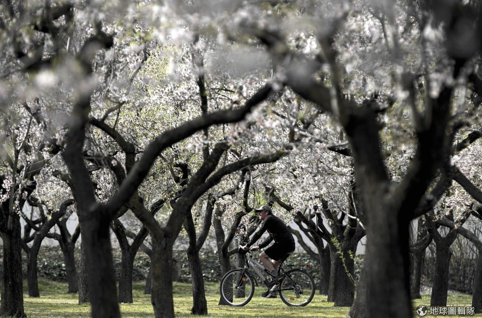 困在儲藏室的腳踏車可以拿出來動一動了,西班牙馬德里市區,民眾趁著氣溫轉暖跨上鐵騎,徜徉在滿開的花樹中。