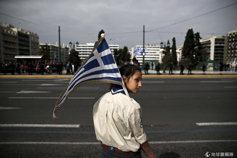 一名女童軍拿著希臘的國旗,站在學生遊行隊伍的前面。即將迎接獨立紀念日的希臘最近為了債務問題四處奔走,他們表示將會在 30號的時候再提出一系列的改革計劃給歐盟,希望能解決現金短缺的問題並避免拖欠債務。