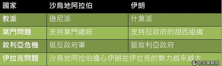 沙烏地阿拉伯跟伊朗在很多議題上看法都不一樣。表格、資料整理:地球圖輯隊。