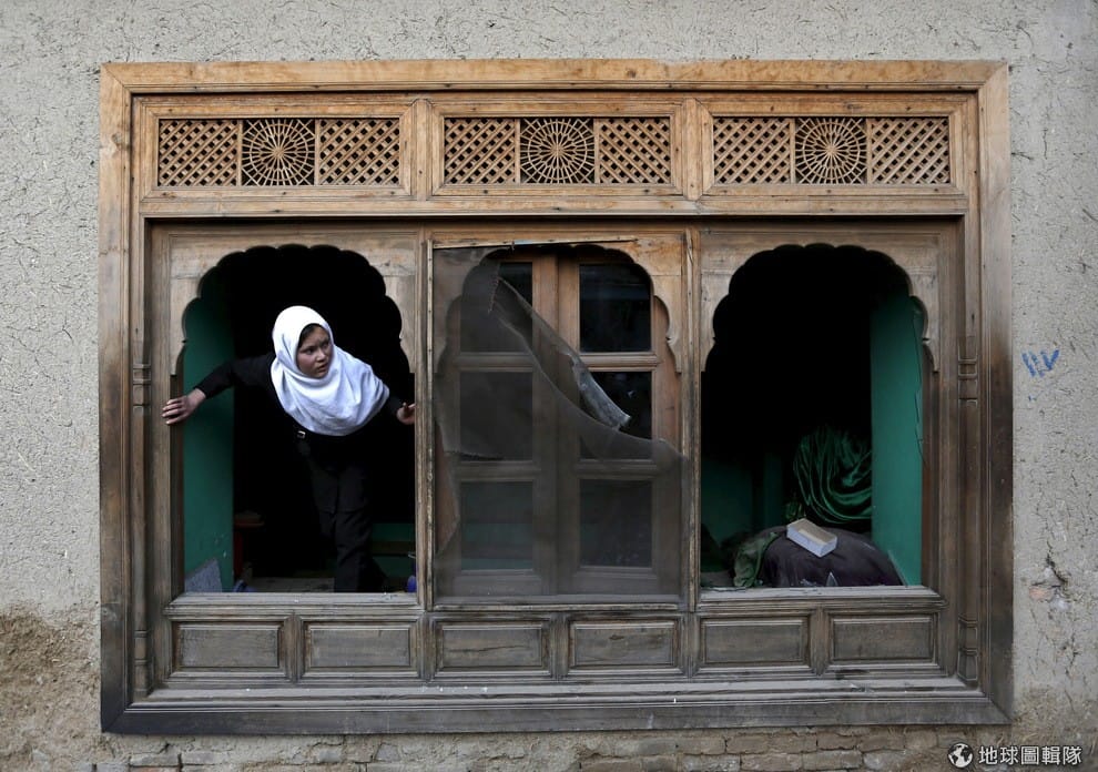 炸彈爆破後,一名阿富汗少女從毀損的寺廟窗口往外看。25號的時候,阿富汗首都靠近總統府的地方發生自殺炸彈案,造成 6人死亡,30多人受傷。