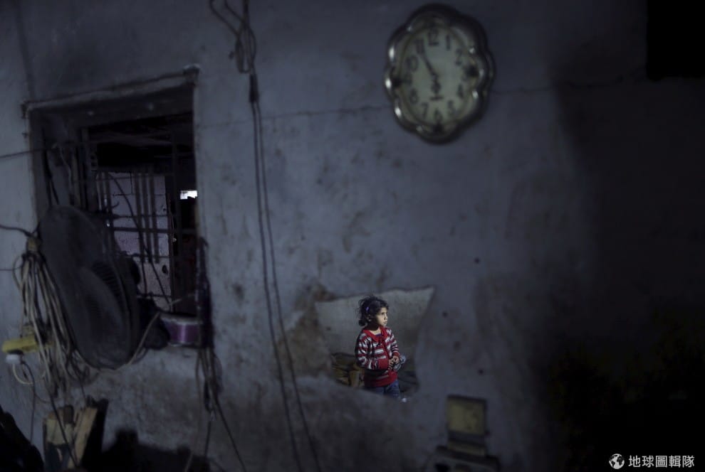 鏡子的碎片裡倒映出一名巴勒斯坦女孩。加薩走廊北部地區停電,女孩跟她的家人只好在家裡點起火把照明。