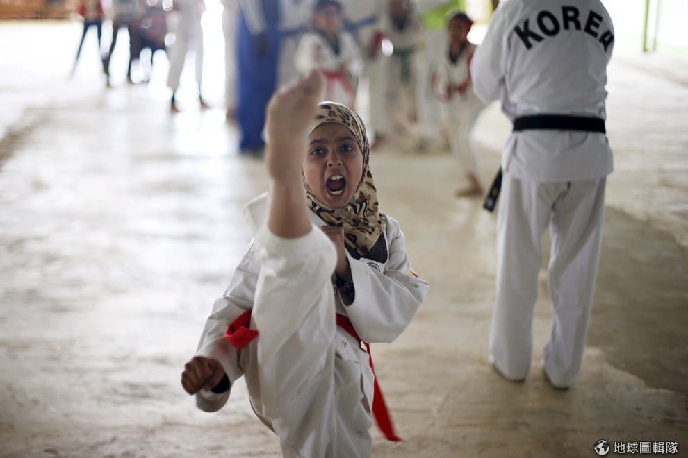 約旦的難民營裡,敘利亞女孩正在練習跆拳道。韓國跆拳道協會(Korean Taekwondo Academy)成立於 2013年,他們每個禮拜會在約旦舉辦 4堂武術課,教難民小朋友武術,現在有大約 300名敘利亞小孩在協會上課。