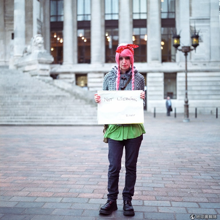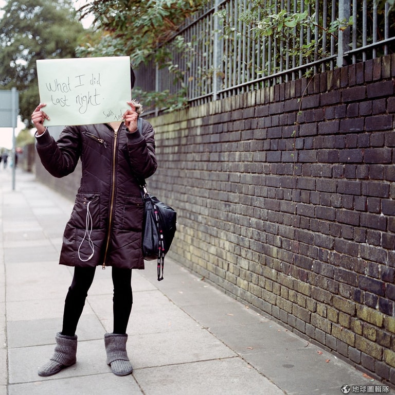 女子用海報擋住臉,當被問到後悔什麼時,她寫道:「我昨晚做的事。」Photo credit: Alecsandra Raluca Dragoi